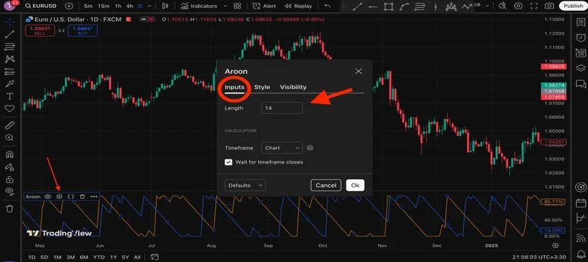 При торговле на множественных таймфреймах и желании использовать индикатор Aroon на различных платформах можно также настроить период. Для этого следует нажать на иконку настроек, выбрать «Входы», а затем ввести предпочтительный период, как показано на изображении ниже.