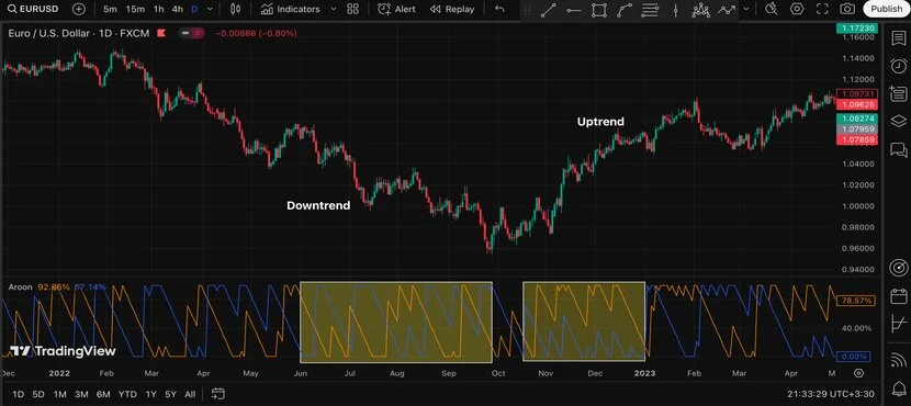 Aroon Down: {(14 – 8) / 14} * 100 = 42.86